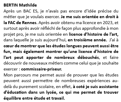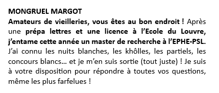 MONGRUEL Margot En VISIO de Paris | Bac L OIB | Prépa Lettres puis diplôme de premier cycle (licence) à l’Ecole du Louvre ; je suis actuellement en M1 à l’Ecole Pratique des Hautes Etudes-PSL | D305 | ||