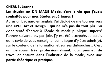CHERUEL Jeanne En VISIO | Euro anglais général ( HGGSP- SES-LLCE) | CPGE art et Design et maintenant DN MADE mode, savoir-faire luxe | D310 |