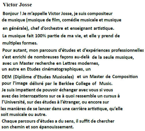 JOSSE Victor | Bac L option OIB | License et Master de Lettres modernes (Rennes 2), Master d'études cinématographiques (Rennes 2), DEM de composition (Conservatoire de Rennes), Master of Music Scoring for Film TV Video Games (Berklee College of Music) | D307 | ||