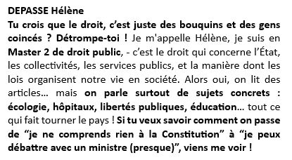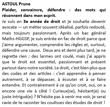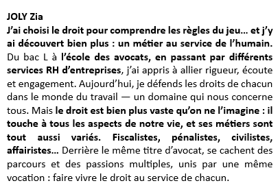 JOLY Zia | Baccalauréat littéraire | Faculté de droit (master droit du travail) + école des avocats | Avocate | C202 | |