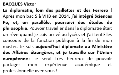 BACQUES Victor | Bac S (2014) | Sciences Po / Philosophie | Diplomate - Ministère de l'Europe et des affaires étrangères | C202 | |