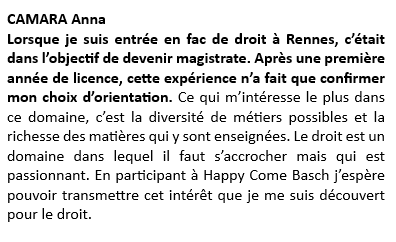 CAMARA Anna | Bac général : spécialités SES , HGGSP , section européenne, option DGEMC | Licence 2 droit général à la faculté de droit de Rennes | C102 | ||