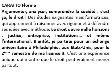 CARATTO Florine | Bac Générale spécialités Mathématiques et Sciences économiques et Sociales, Option Droit et Grands Enjeux du monde contemporain | Droit (licence 3 actuellement avec un semestre 2 à l'étranger) | D208 | ||
