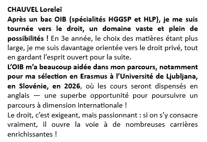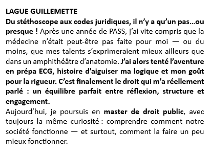 LAGUE Guillemette | OIB BAC S | PASS/Prépa ECG/licence droit/Master droit public | C103 | ||