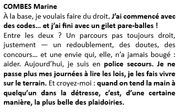 COMBÉS Marine | Bac 2022: HGGSP/ SES/ Maths, option droit et section européenne anglais | 1 an de droit (échec)/ Concours de gardien de la paix (police nationale)/ 1 an d’école à l’ENP de Saint-Malo / affection au CSP de Levallois-Perret (police secours) | Gardien de la Paix | C101 | |