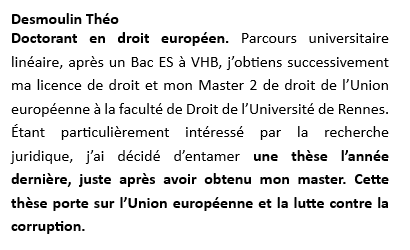 DESMOULIN Théo | Bac ES | Licence de droit à l’Université de Rennes, puis Master de droit européen toujours à l’université de Rennes | Doctorant en droit européen a l’Universite de Rennes, je travaille sur « l’action extérieure de l’Union européenne en matière de lutte contre la corruption » | C202 | |