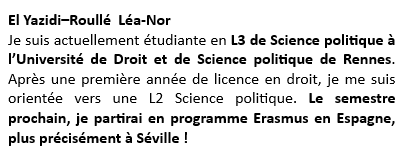 EL YAZIDI-ROULLÉ Léa-Nor | 2nd, 1ère et Terminale générale | Licence de Science politique | C204 | ||