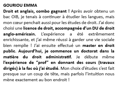GOURIOU Emma | OIB Bac S | Licence et Master en Droit | Doctorante en droit | C202 | |