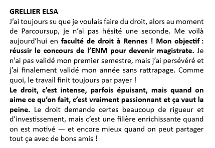 GRELLIER Elsa | Bac général spécialités SES HGGSP et section européenne anglais + option DGEMC | Licence 2 en droit général de Rennes | C102 | ||