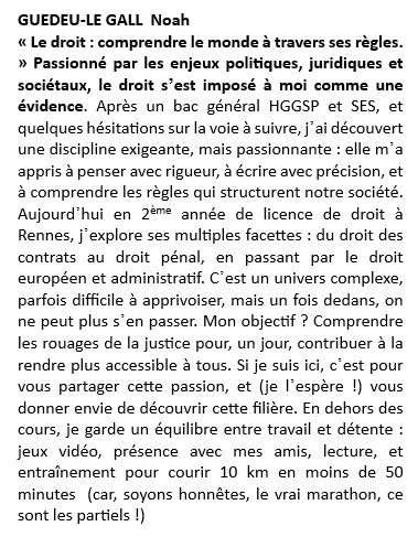 GUEUDEU-LEGALL Noah | Bac Général spécialité HGGSP SES | Faculté de Droit et de Science politique à Rennes, actuellement en L2 | C203 | ||