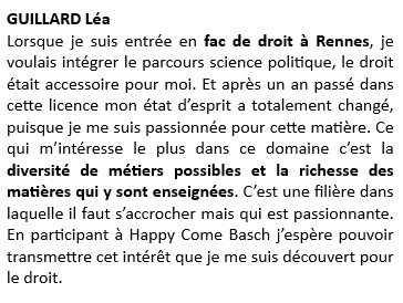 GUILLARD Léa | Bac général spécialités HGGSP SES section européenne anglais et option DGEMC | Licence 2 en droit général à la faculté de Droit de Rennes | C102 | ||