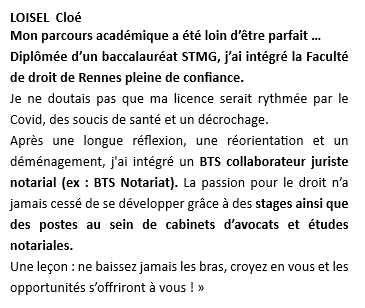 LOISEL Cloé En VISIO de Paris de 14H30 à 15H30 | Baccalauréat STMG option Mercatique | Licence de droit + BTS collaborateur juriste notarial | Juriste/ Assistante juridique | C104 | |