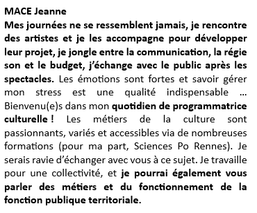MACÉ Jeanne | SES | Sciences Po Rennes | Chargée de mission Culture pour une communauté de communes | C203 | |