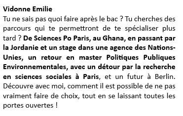 VIDONNE Émilie | OIB, spécialités Humanités, Maths, HGGSP | licence de Sciences Po Paris, master Environmental Policy et master Etudes Environnementales à l'EHESS | C204 | ||