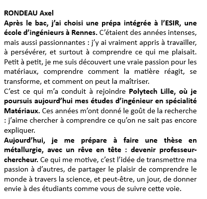 Classe préparatoire universitaire aux grandes écoles ESIR ( Ecole Supérieure d’Ingénieur de Rennes ) puis Admission parallèles sur titre pour rejoindre la spécialité Matériaux à Polytech Lille. Je suis actuellement en 4ème année