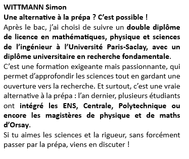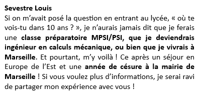 CPGE Scientifique 2 ans : MPSI puis PSI* à Nantes. École d'ingénieur generaliste Centrale Marseille 3 ans + année de césure en stage ingénieur et service civique mairie de Marseille en animation avec retraités et enfants.