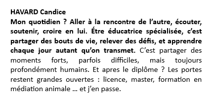 Retour aux domaines Nom ÉtudiantFormation suivie au lycée VHBFormation suivie après le lycée VHBMétier ou activité actuels"Mon Parcours !"SALLEHAVARD CandiceBac GénéralDiplôme d’état d’éducatrice spécialisée et master santé publique parcours criminologieMon ParcoursPermanence 03